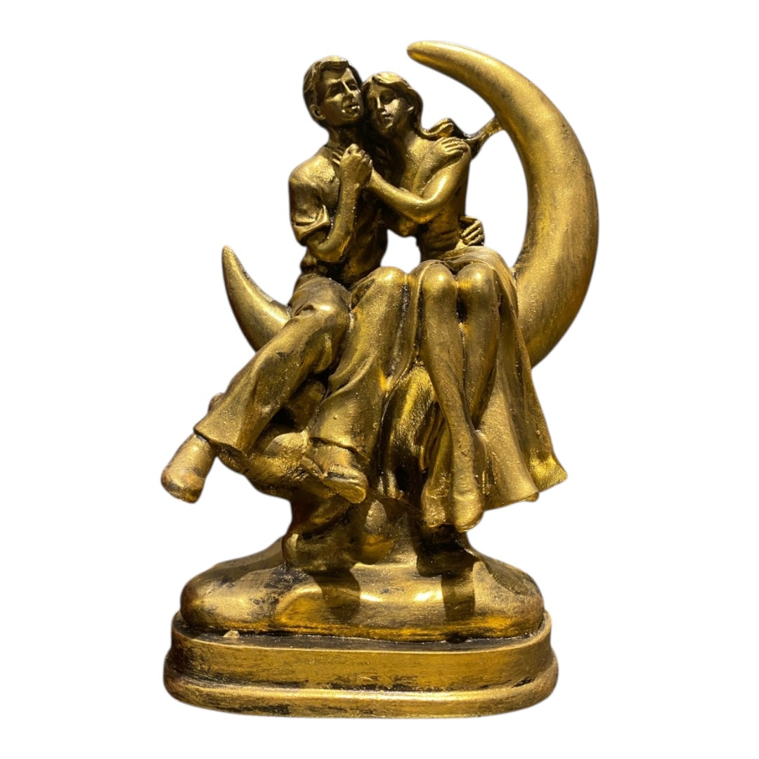 Capture a piece of eternal romance with this beautiful, evocative sculpture. Finished in a rich antique gold or bronze patina, this figurine features a couple embracing tenderly while seated upon a crescent moon.