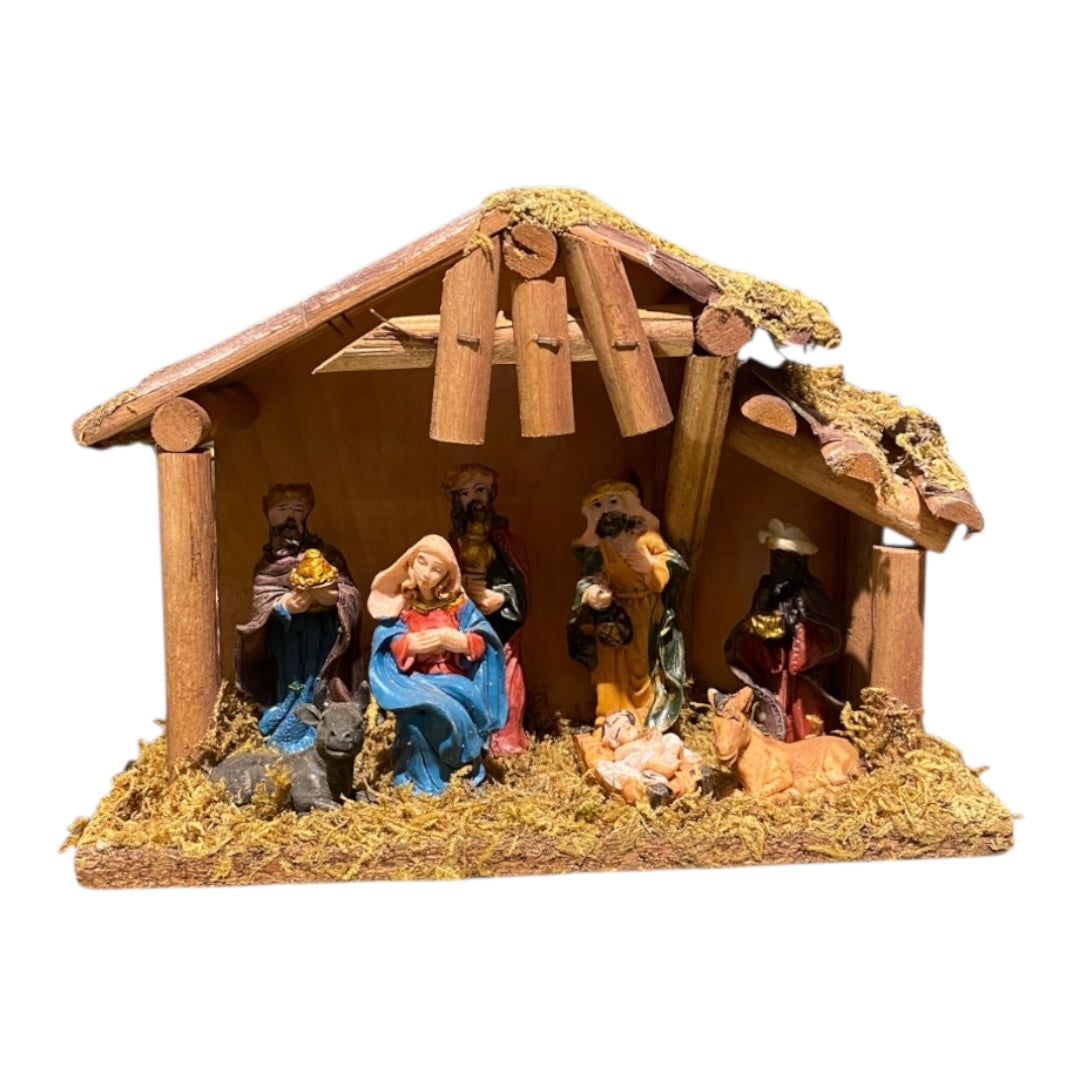 Bring the true meaning of Christmas into your home with this beautiful and traditional Nativity Scene. Crafted with intricate detail, the set features a rustic wooden stable with a moss-covered roof and all the essential figures: the Holy Family (Mary, Joseph, and the infant Jesus in the manger), the Three Wise Men bearing their gifts, and the humble stable animals (donkey and ox). This timeless display serves as a wonderful centerpiece for your holiday décor and a precious reminder of the reason for the season.